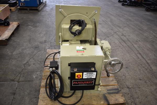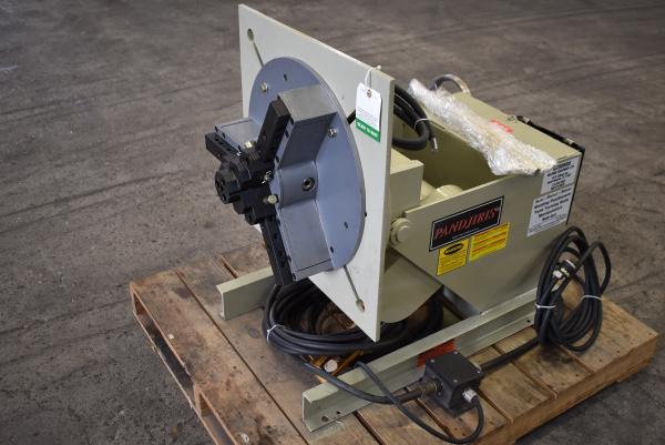 Used Pandjiris 1,500lb Welding Positioner and Chuck Model: 15-4FB 1,500lb Capacity Variable Speed Rotation Manual Tilt Fixed Height 15'' Gripper Chuck Hand Pendant and Foot Pedal Controller 120 Volt Input 90 Day Warranty